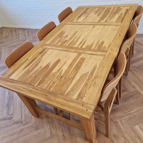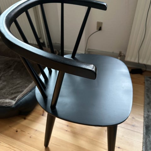 Flotte spisebord stole 4 stykker, i sæbebehandlet egetræs med sort læder på sæde og ryg stykke