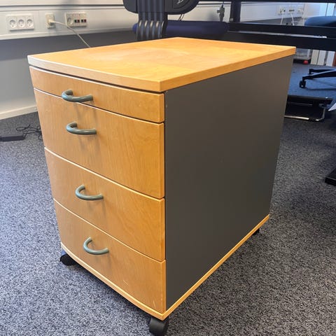 Reol med skrivebord i træ og metal med hylder og hjul