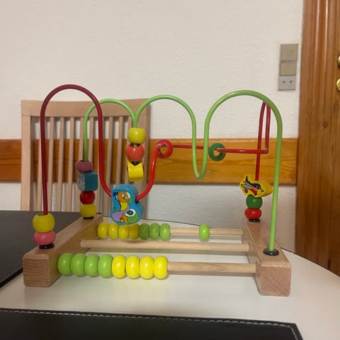 IKEA Børnelegetøj Motoriklegetøj med farverige perler på snoede metaltråde monteret på en træramme. Legetøjet er designet til at stimulere finmotorik og hånd-øje-koordination hos børn.