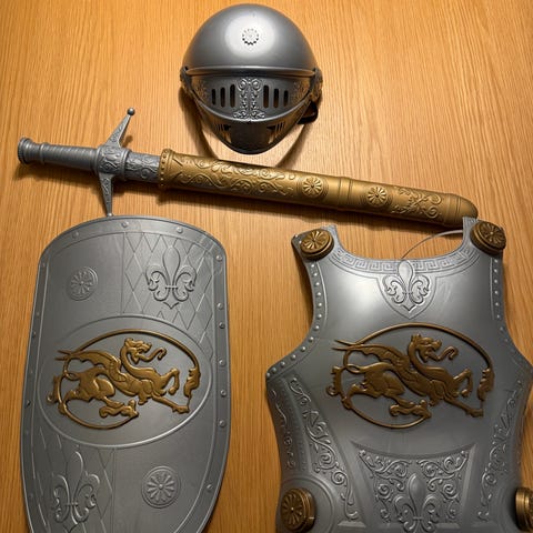 ridder og hest legetøjssæt med detaljeret udstyr inklusive rustning, våben og tilbehør. Figuren er klædt i ridderrustning, og hesten har sadel og beskyttelse. Sættet indeholder også forskellige våben som kæde, morgenstjerne og skjold. Egnet til rollespil og samling.