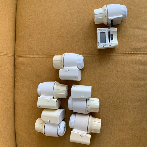 Komplette sæt af radiatorventil og termostat fra Danfoss. Ventil og termostat sælges også separat. Dem på billedet er solgt, men 3 mere haves i god stand.