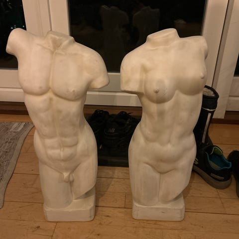 To skulpturer på fod udført af kunstneren Per Hillo. Henholdsvis en kvindelig og mandlig torso. I smukke brunlige nuancer. Højde 50 cm. Vægt ca. 4 kg. pr. stk.