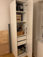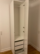 Hvide, PAX, med indretning som vist på billeder. Har været skruet sammen, dvs der er to huller på side af skabet. I bund af ene skab er lavet hul i bagbeklædning for at få strøm ind. Står på 5 sal og kan ikke være i elevatoren :-).