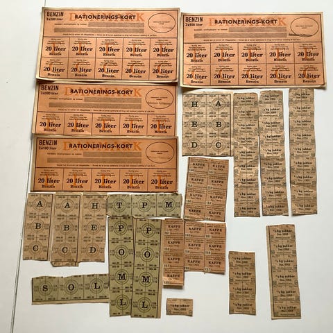 ark med rarioneringsmærker forskellige farver, værdier og bogstaver. Der er 10 ark.