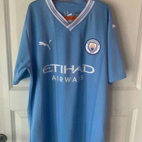 Puma Manchester City fodboldtrøje i lyseblåt stof, størrelse M. Trøjen er fremstillet i polyester og har logoer fra klubben og Puma. Designet til herre.
