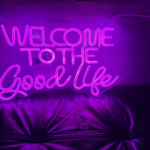 Neon skilt med teksten "We Are Open" i farverne gul, pink og blå. Skiltet er lavet med LED-lys og er velegnet til at indikere åbningstider eller til dekorative formål i butikker eller lignende miljøer.