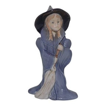 Barnets Fantastiske Verden keramik figur af en heks iført blå kappe og sort hat med gule stjerner. Figuren er håndmalet og viser en detaljeret fremstilling af en heks med kost. Produktet er mærket med serienummer 2549 og teksten 'The make-believe world of children' på undersiden.