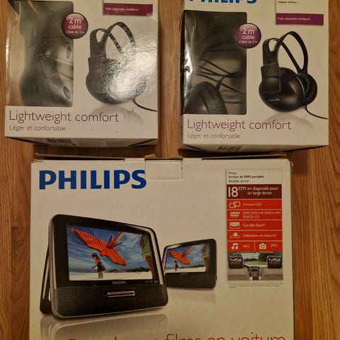 Philips dvd sæt til bil med 2 skærme brugt 2 gange fejler ingenting ingen ridser eller noget man skal bare selv købe det stik til cigartænderen det har jeg ikke mere, alt andet følger med og virker som det skal kvittering haves men ikke mere garanti på nypris var 1399,-