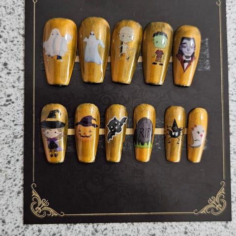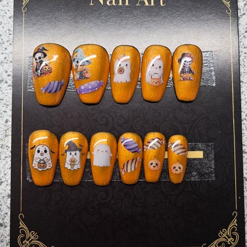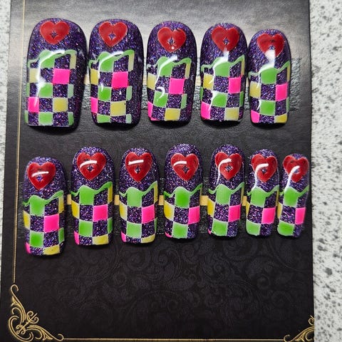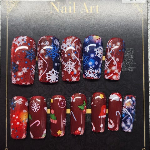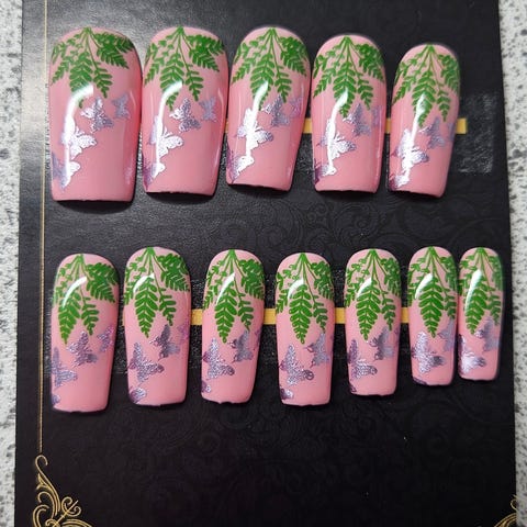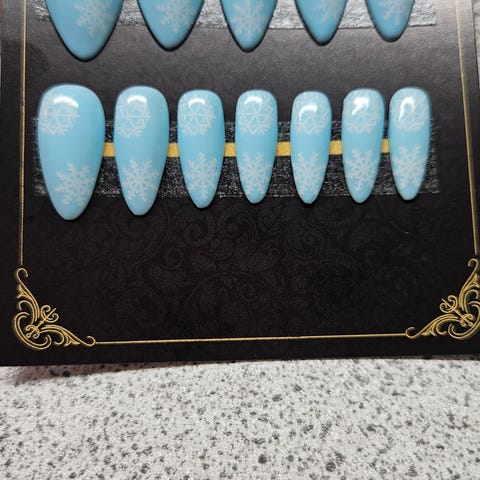 Håndlavet press on negle med negle lim, fil, og neglebånds skubber. pris og nr fremkommer på billedet, slået op flere steder. Har flere annoncer med forskellige negle. Køb af et sæt inden kl 19 sendes samme dag. Priser fra 75 kr. Til 150 kr.