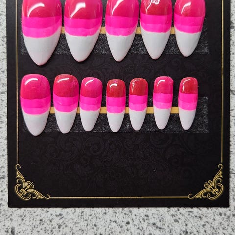 Håndlavet press on negle med negle lim, fil, og neglebånds skubber. pris og nr fremkommer på billedet, slået op flere steder. Har flere annoncer med forskellige negle. Køb af et sæt inden kl 19 sendes samme dag. Priser fra 75 kr. Til 150 kr.