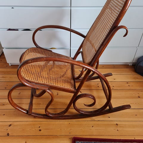 Antik gyngestol i træ med tilhørende skammel. Begge dele har en polstret overflade med et mønstret stof i mørke farver. Stolens ramme er lavet af træ med drejede detaljer på ben og ryglæn.