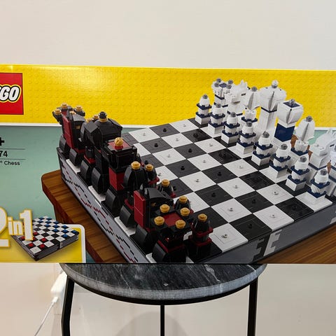 Et lego skak spil med alle brikker og spille plade, stort set urørt. Kasse til spillet har nogle skrammer