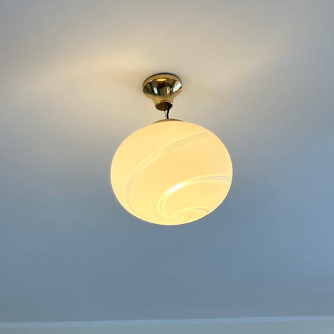 Smukkeste lavendel-stribede Murano pendel på 20 cm, der fungerer flot både som hyggebelysning i et hjørne eller over et spisebord eller måske som del af et sæt henover køkkenbordet. Vi har to styks på lager.