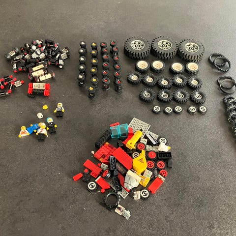 LEGO Andet reservedele og hjul i forskellige størrelser og farver. Sættet indeholder hjul, tandhjul, aksler og diverse små dele, primært i sort, grå, rød og gul. Egnet til reparation eller udskiftning i LEGO-konstruktioner og frestyle konstruktion