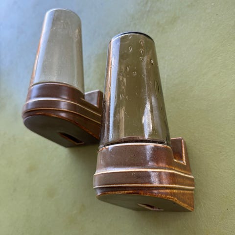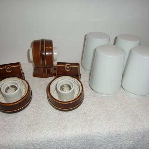 Badeværelseslampe / vådrumslampe fra Ifö tegnet af Sigvard Bernadotte. Brun porcelænsholder og skærm af hvid opalglas.