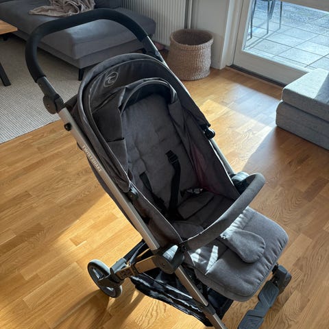 Super god klapvogn som ikke fylder meget når den er klappet sammen. Ryglænet kan lægges næsten helt ned, så barnet kan sove lur. Har myggenet og regnslag til.