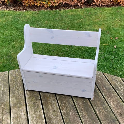 Fin lille børnebænk med skjult rum med plads til opbevaring af en masse legetøj. Vi har brugt den i gangen til huer og handsker.