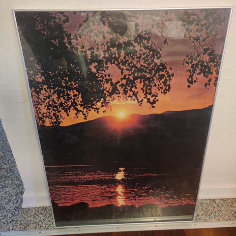 Solnedgang over en by. Farverne domineres af orange og mørke nuancer. Velegnet til vægophæng som dekorativt element.
