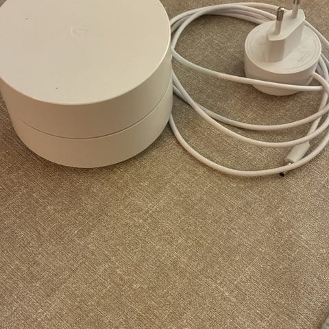Google Nest Wifi Router med hvidt design. Enhederne fungerer som trådløse routere til netværksforbindelse og er beregnet til hjemme- eller kontorbrug. Materialet er plast, og de har et kompakt rundt design.