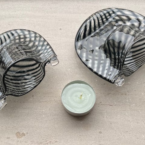 Smukke holdere til fyrfadslys med svirl fra Gudhjem Glasrøgeri / Pernille Bastrup. I flot stand uden brugsspor