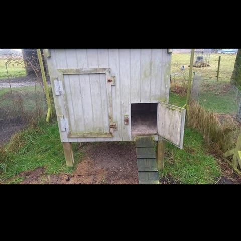 Der er intet råd i træværket. Taget kan man åbne så man kan se hvad der er dernede. Der medfølger også en lille foderhus.
