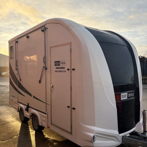 Equi Trek Nordik Star hestetrailer med dimensioner 3375x1625 mm. Traileren er designet til transport af heste og har en hvid overflade med flere vinduer og ventilationsåbninger. Den er udstyret med låger og sikkerhedsfunktioner til dyretransport.