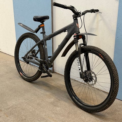 Nishiki Mountainbike i blå farve designet til mænd. Cyklen har en robust ramme og er udstyret med forgaffel med affjedring, skivebremser foran og bagpå, samt gearsystem med flere hastigheder. Egnet til terræn og off-road cykling.