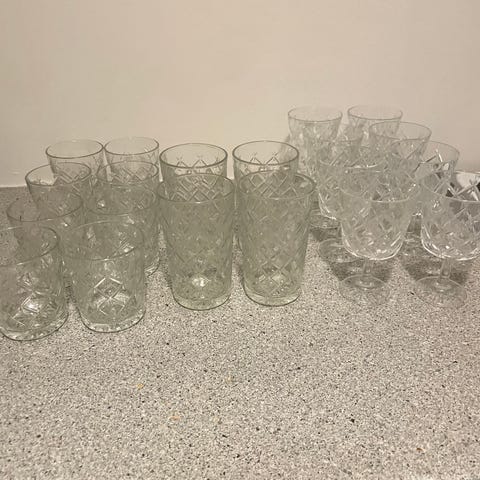 IKEA Glas Sæt bestående af 5 klare glas. Glasene er designet til brug som drikkeglas og har en klassisk form med fod. Materialet er klart glas, velegnet til daglig brug.