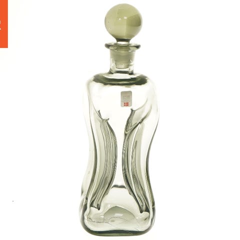 Rund glaskaraffel med en glat, gennemsigtig overflade, der måler 20x17 cm. Den har en bred bund og en smal hals, hvilket gør den perfekt til servering af vin eller vand. Karafen har en metalprop, der sikrer en tæt lukning. fra Holmegaard