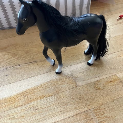 En plastikhest med en lang manke og hale. Den har en lyserød grime og blide ansigtsdetaljer. Hesten er hvid med gyldne hove, og størrelsen er omkring 30x30 cm.