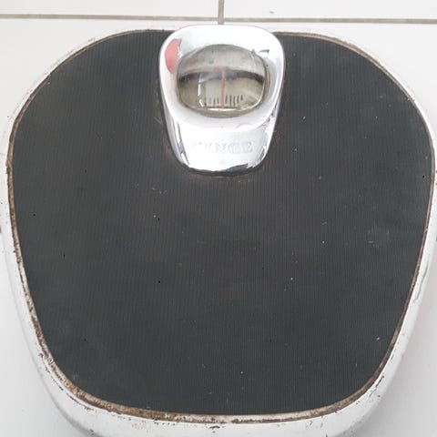 Retro mekanisk badevægt med metaloverflade og analogt display til vægtmåling. Designet til personlig brug til at måle kropsvægt præcist.