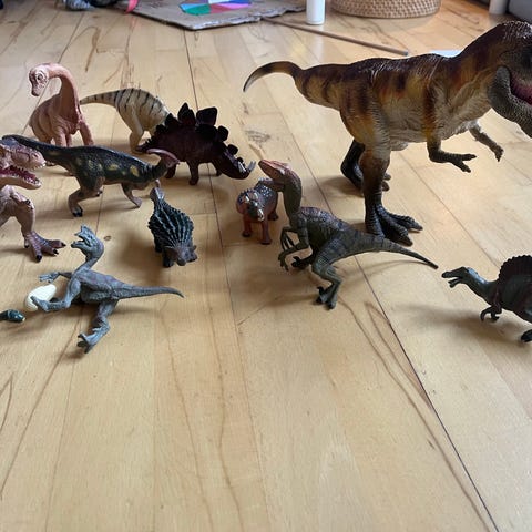4 dinosaur figurer: Allosaurus, Parasaurolophus, Camarasaurus plus en ukendt.