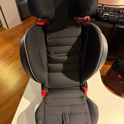 Sædet har en polstret, mørk farve og er lavet af materialer egnet til børns sikkerhed og komfort under bilkørsel.