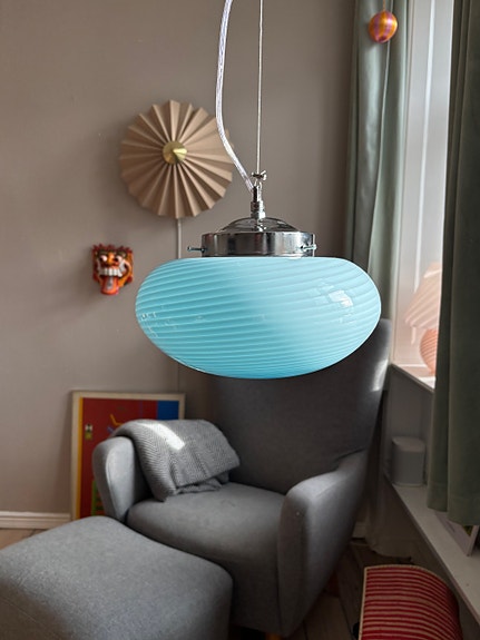Lampen er enorm smuk i sit swirl. Glasset er mundblæst i en oval form med betagende swirl mønster. Da lampen er håndlavet kan der være små unikke kendetegn ved glasset.