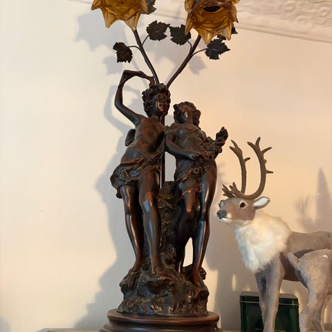 Antik lampe fra 1920 i bronze med billede på de 4 sider.