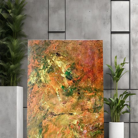 Maleri med motiv i grønne, gule og blå farver. Størrelse 1x1 m.Maleriet har en tekstureret overflade med forskellige nuancer og former, der skaber et levende og dynamisk udtryk. Velegnet til dekoration af vægge i hjemmet eller kontormiljøer.