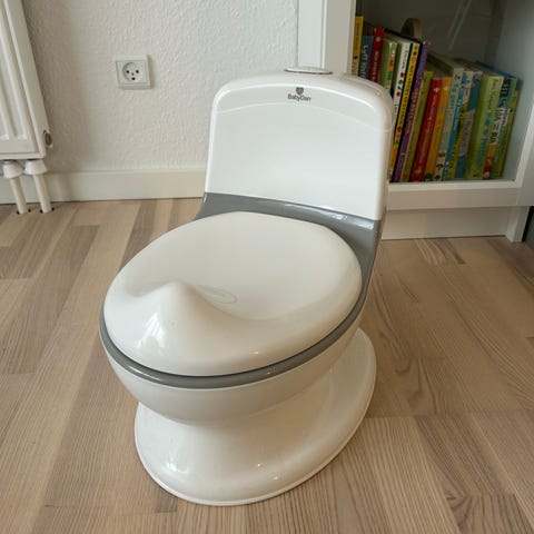 BabyDan børne toilet med indbygget potte. Med skylle lyd. Pænt og velholdt.