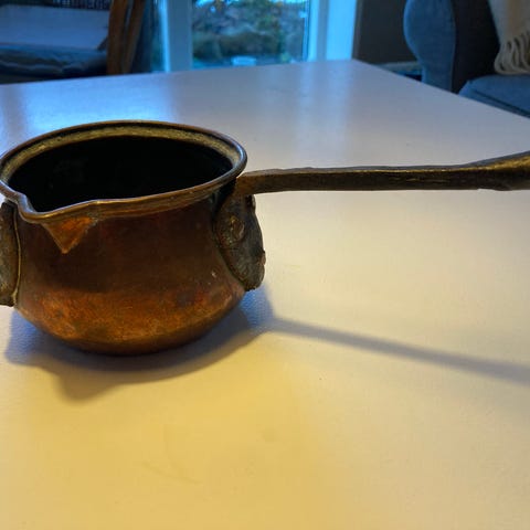 Antik kobbergryde med håndtag og tre ben