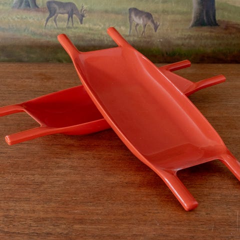 Røde tallerkner i plastik. Retrostil. 3 flade og 3 dybe tallerkner. Dåsen er solgt. Samlet pris.