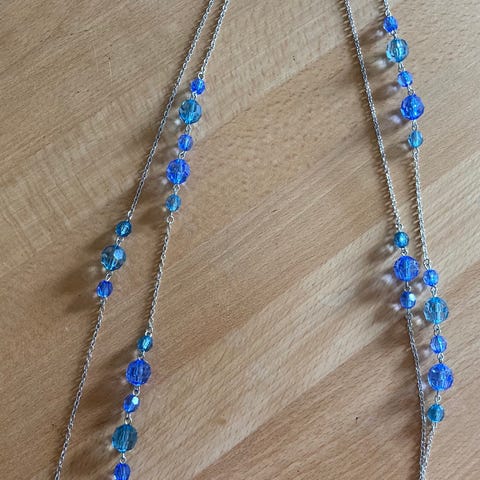 Lang halskæde i sølvlook med sten/perler i en turkis nuance.
