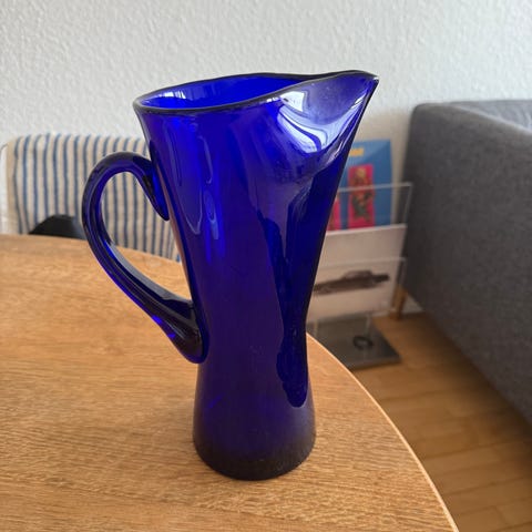 Flot glas kande fra Holmegaard designet af Jacob.E.Bang. fra Fyens Glasværk. Den er som ny.H.26.5 cm.D 12-16 cm. Rigtig flot og dekorativ. Kan også bruges som vase.