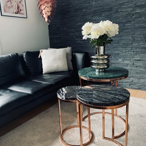 Sæt med runde sofaborde. Mille fra Canett. Metalben med solide glasplader i marmorlook.