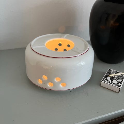 Kähler fyrfadsstage i keramik med hvid finish. Kugleformet design med mange små huller for lysgennemstrømning. Indeholder en aftagelig holder til fyrfadslys. Velegnet til indendørs brug som dekorativ belysning.