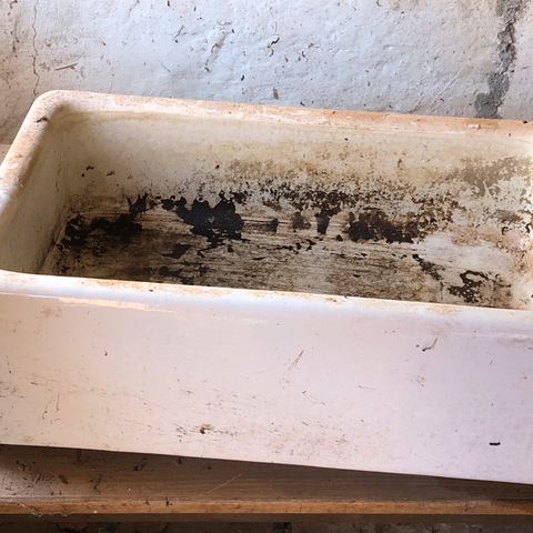 Vintage. Vask og vandbeholder i emalje, fransk. Beholderen kan fikses eller det hele blot bruges æstetisk, f.eks på overdækket udendørs areal ell. lign. Vasken har ikke bundprop/hul.