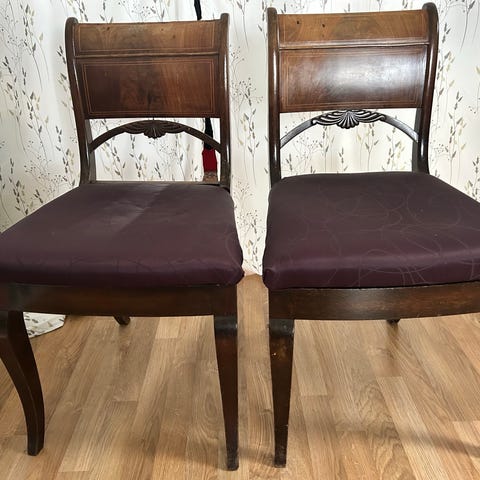 2 antikke klismos stole, 170 år gl., b: 50 d: 55 h: 85, To flotte stole. God stand.