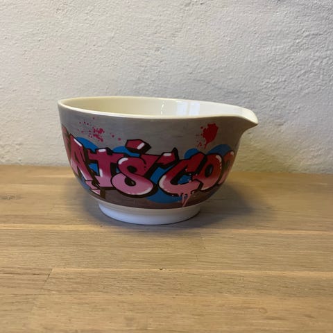 Flot sæt med 2 Margrethe-skåle i porcelæn designet af Lasse Åberg for Rosti Mepal. Sjældne og udgåede modeller med de finurlige, humoristiske figurer, som kendetegner Åbergs design.