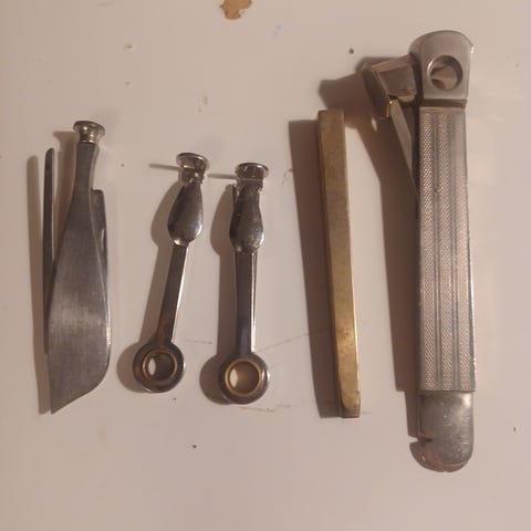 Jeg ved ikke meget om den - arvet fra svigerfars loft og er meget fin. Lille pibe stopper eller renser / værktøj. Håber den havner et sted hvor den bringer glæde.