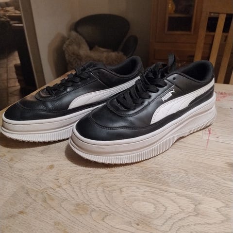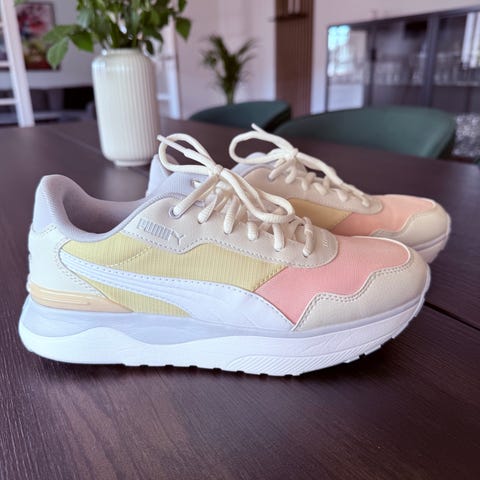 Puma sneakers i størrelse 40 med hvid og lyserød farve. Skoene har snørebånd og en gummisål med mønster for greb. Materialet er primært syntetisk med tekstildetaljer. Velegnet til daglig brug og afslappet tøjstil.