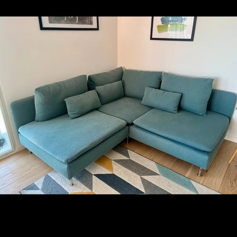 Sælger vores IKEA SÖDERHAMN sofa (3-personers) inkl. matchende taburet i mørkegrå farve. Sofaen har kun været brugt let som ekstra siddeplads i hjemmebiograf, så både puder og betræk står rigtig pænt.