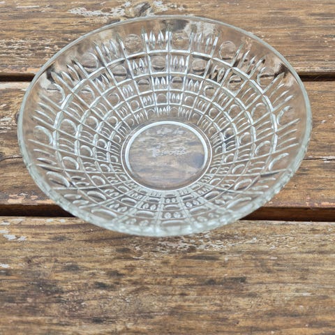 Flot glasskål med blondekant. Uden skår, men glasset er blevet "mælket" i nuance pga. Opvaskemaskinen. Måler 24,5 cm i diameter og 8,5 cm I højden.